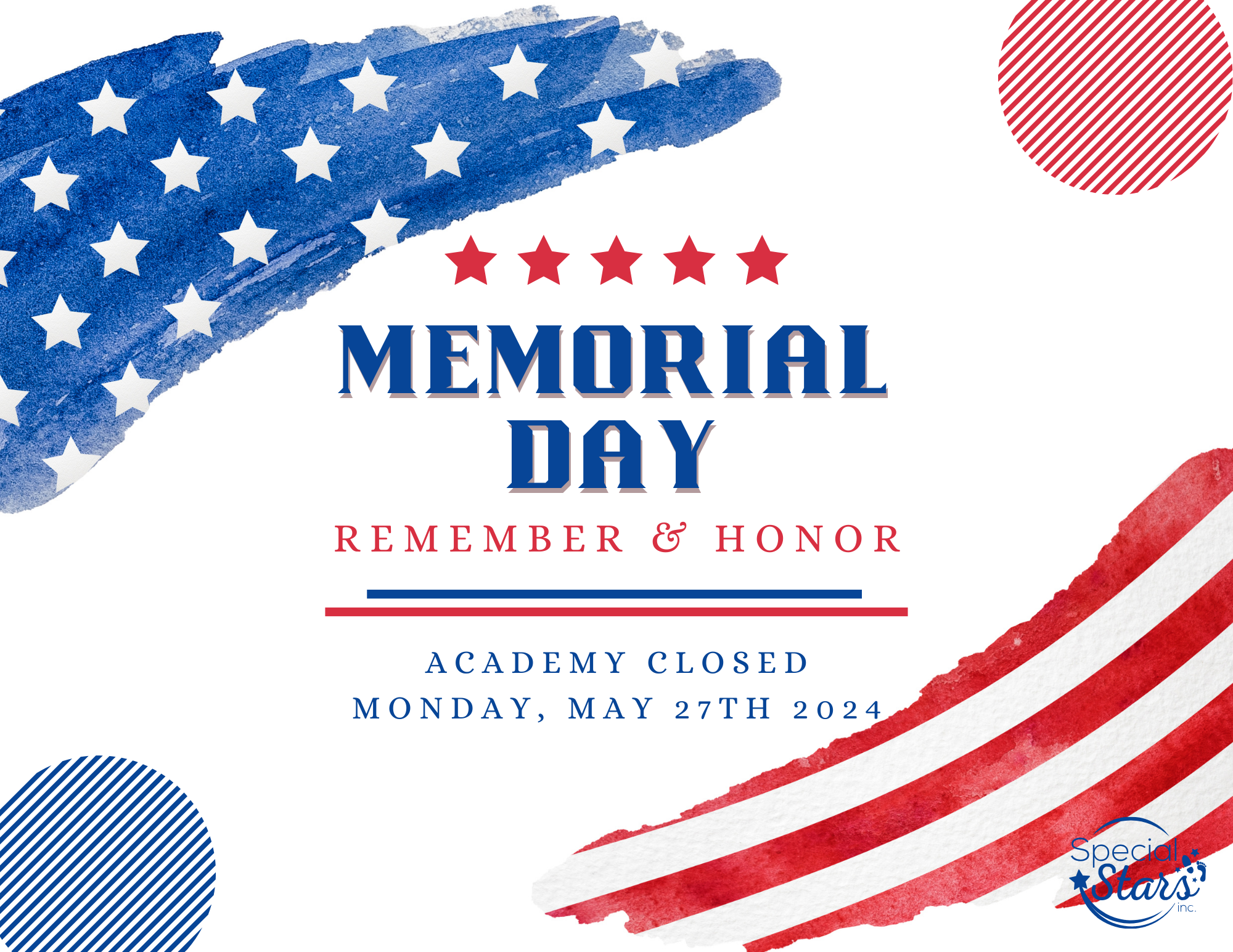 Academy Closed For Memorial Day (5/27/24) May 27 Written By Special Stars Inc NFP Special Stars Inc NFP