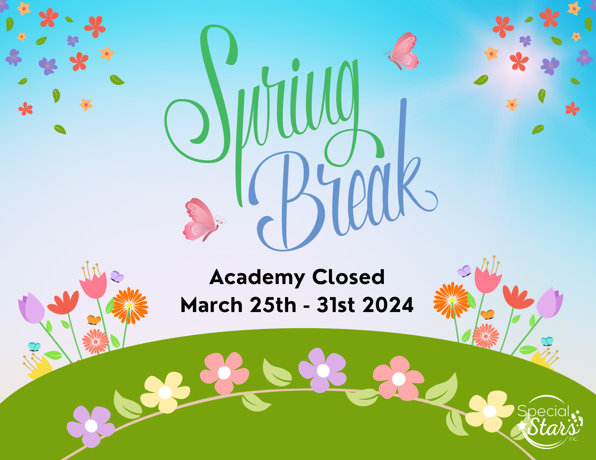 Academy Closed For Spring Break (3/25/24 - 3/31/24) Mar 25 Written By Special Stars Inc NFP Classes Resume Monday, April 1st 2024 Special Stars Inc NFP